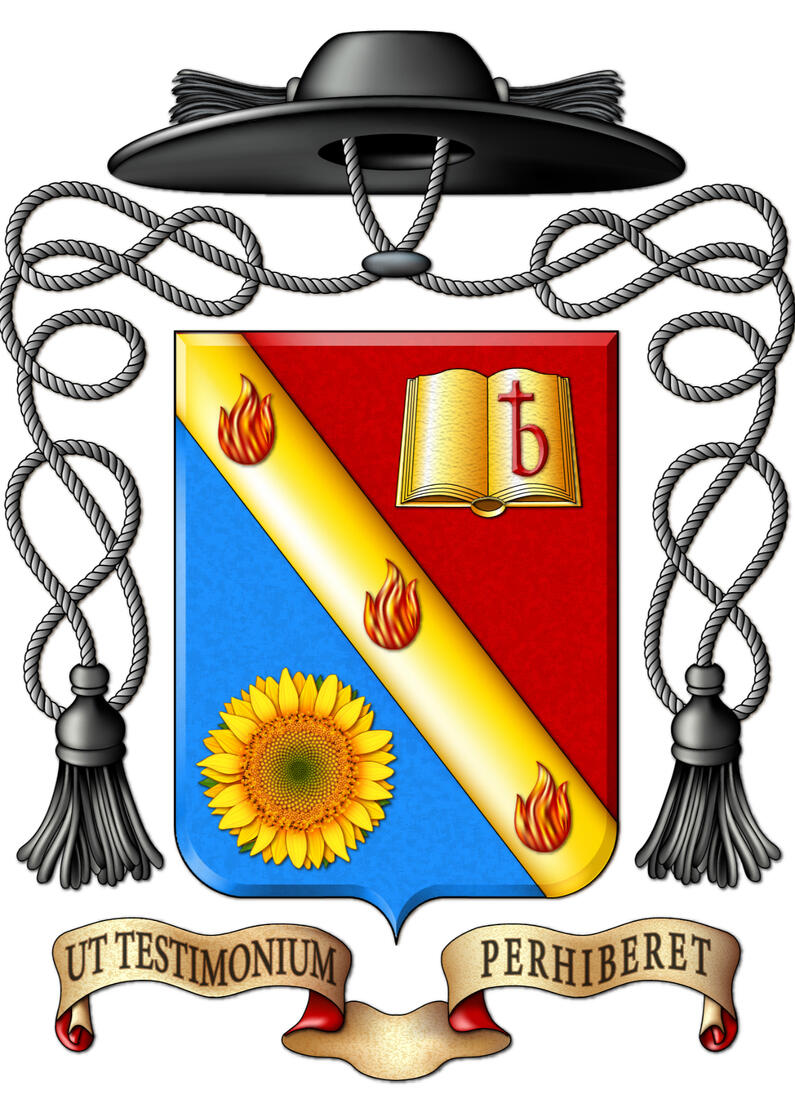 Lo scudo, dalla forma “sannitica”, è cosi araldicamente descritto:Trinciato: nel primo d’azzurro, al girasole al naturale; nel secondo: di rosso, al libro aperto d’oro caricato a sinistra dalla lettera minuscola “b”, la cui estremità superiore terminante a croce latina del campo; alla banda d’oro caricata di tre fiammelle al naturale attraversante sulla partizione.Il motto: UT TESTIMONIUM PERHIBERET (Gv. 1,8), che è in lettere maiuscole lapidarie romane di nero, è caricato su di un cartiglio svolazzante al naturale e foderato di rosso posto in punta.Il tutto è timbrato da un cappello prelatizio (galero) di colore nero, dal quale pendono 2 fiocchi, 1 per lato, dello stesso colore.